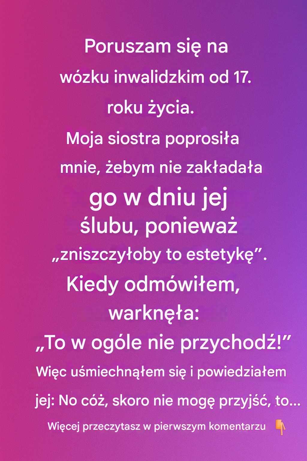 Jeżdżę na wózku inwalidzkim od 17. roku życia. Moja siostra poprosiła mnie, żebym nie używała go w dniu jej ślubu, bo „zniszczyłby estetykę”. Kiedy odmówiłam, warknęła: „To w ogóle nie przychodź!”. Uśmiechnęłam się więc i powiedziałam: „Cóż, skoro nie mogę przyjść, to…” po prostu spełnię jej prośbę. Ale nie spodziewała się, że po cichu odmówię każdej części wydarzenia – od kolacji przedślubnej po rodzinne zdjęcia. Nie sprzeciwiłam się, nie podniosłam głosu; po prostu się wycofałam. To bardzo bolało, bo zawsze wspierałam ją w każdym ważnym momencie jej życia. Mój wózek inwalidzki nie jest rekwizytem; jest częścią mnie i symbolem siły, a nie wstydu. Mimo to postanowiłam, że nie będę się zmuszać do miejsca, w którym nie byłabym mile widziana taka, jaka naprawdę jestem.